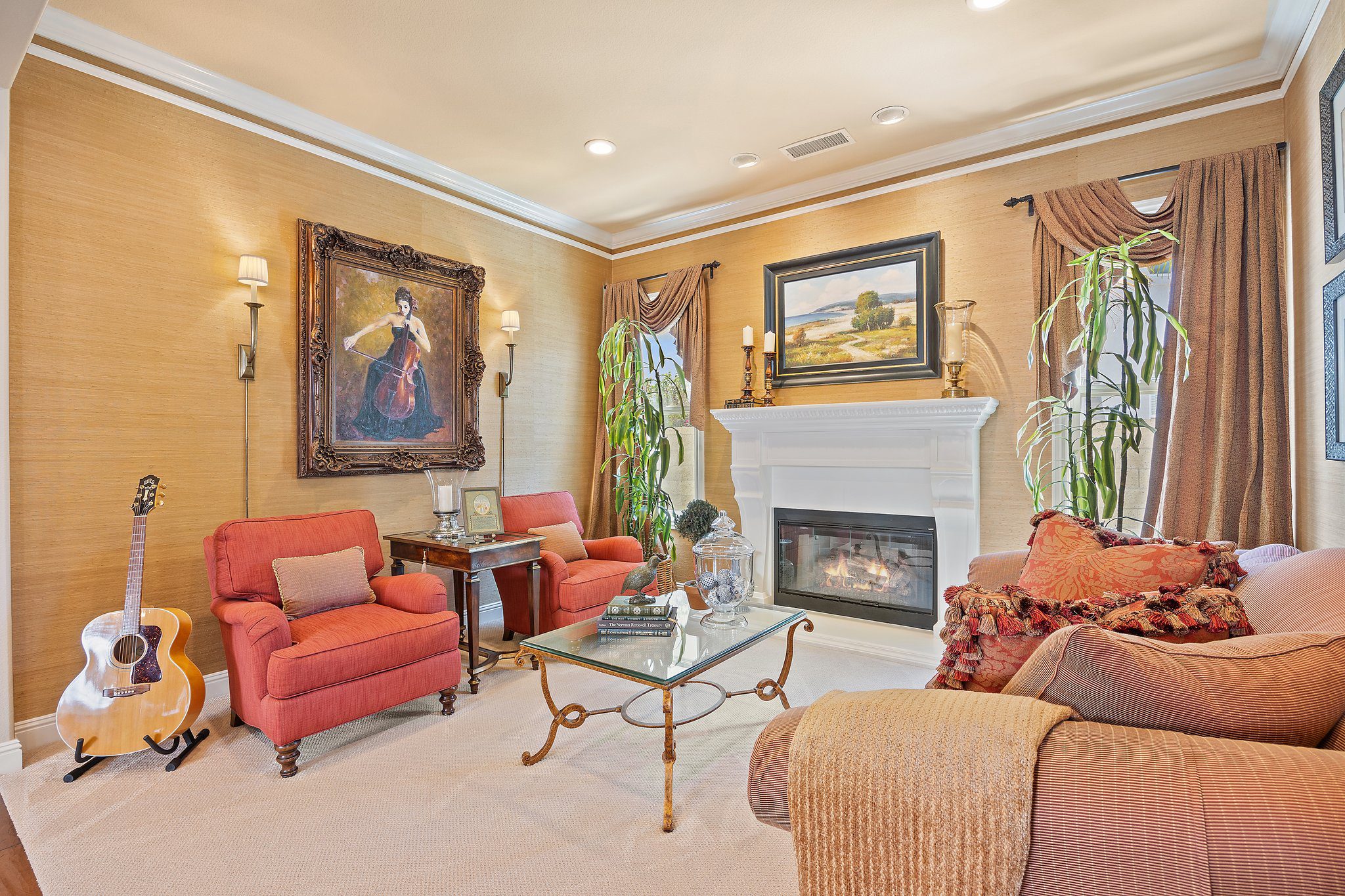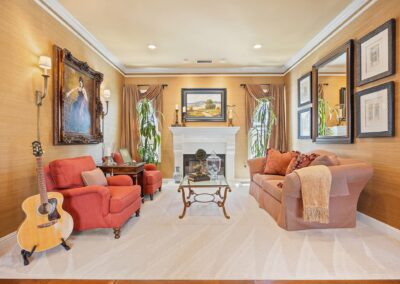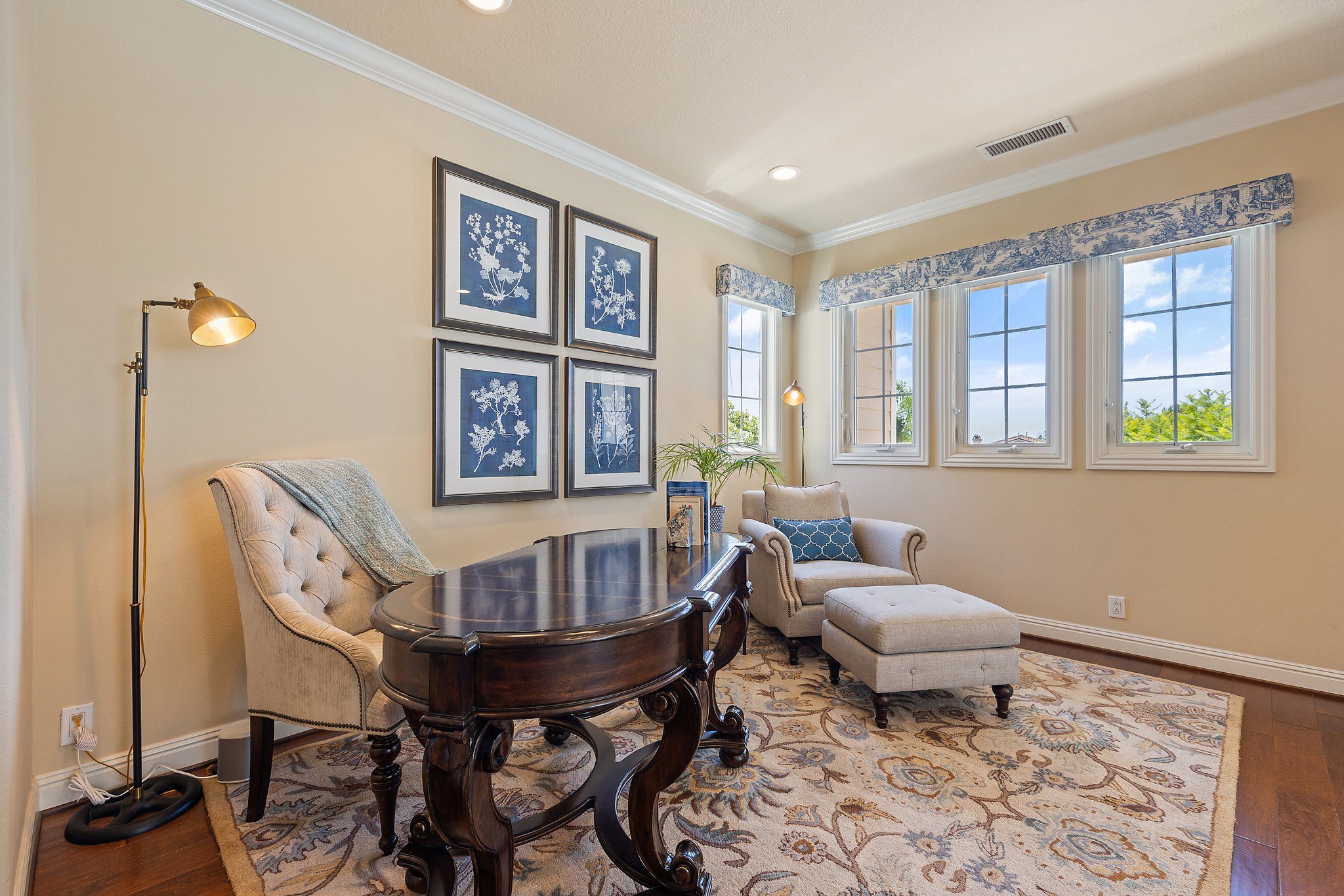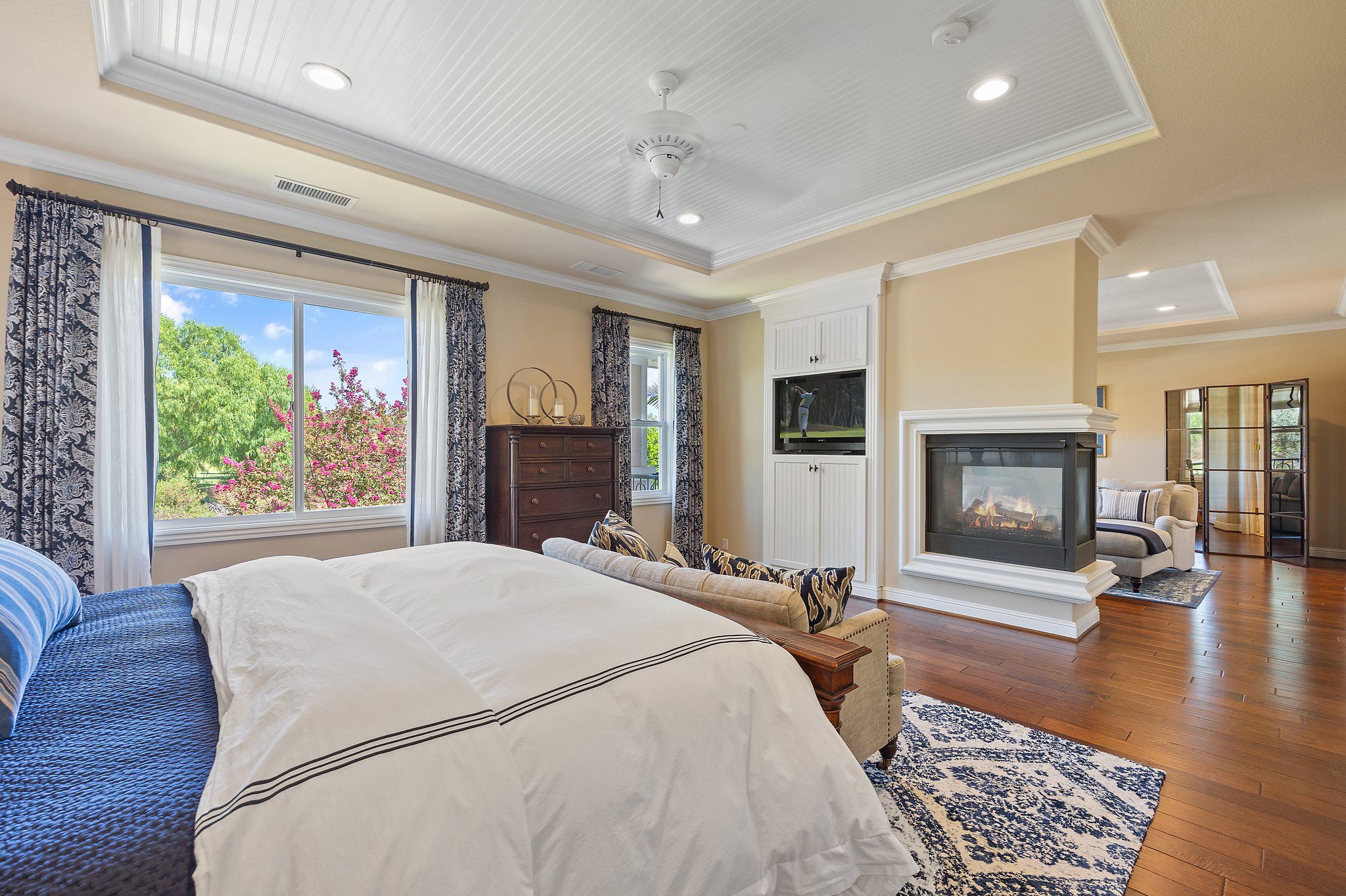 Experience unparalleled luxury in this 4,302 sq. ft. estate, perfectly situated on a tranquil cul-de-sac with views of a serene bird sanctuary and Black Gold Golf Course. This impeccable home has been professionally decorated and features 4 spacious bedrooms each with a private bathroom, including a convenient downstairs suite. The downstairs also features a dedicated office, an expansive great room with a gourmet kitchen, formal dining and living areas, and a versatile loft upstairs. The master suite boasts its own living room, a balcony with natural views, a jetted tub, an oversized shower, and a generous walk-in closet. Highlights include soaring ceilings, walnut wood floors, custom finishes, Monogram appliances, three indoor fireplaces, and a striking chandelier. Outdoors, enjoy refined hardscaping, an upgraded balcony, a covered patio, an outdoor fireplace, and lush landscaping. No HOA or Mello Roos. This estate offers an exceptional blend of sophistication, comfort, and natural beauty, and is conveniently located near shops, dining, parks, top schools, and freeways. A true must-see, this home is presented in model-like condition.